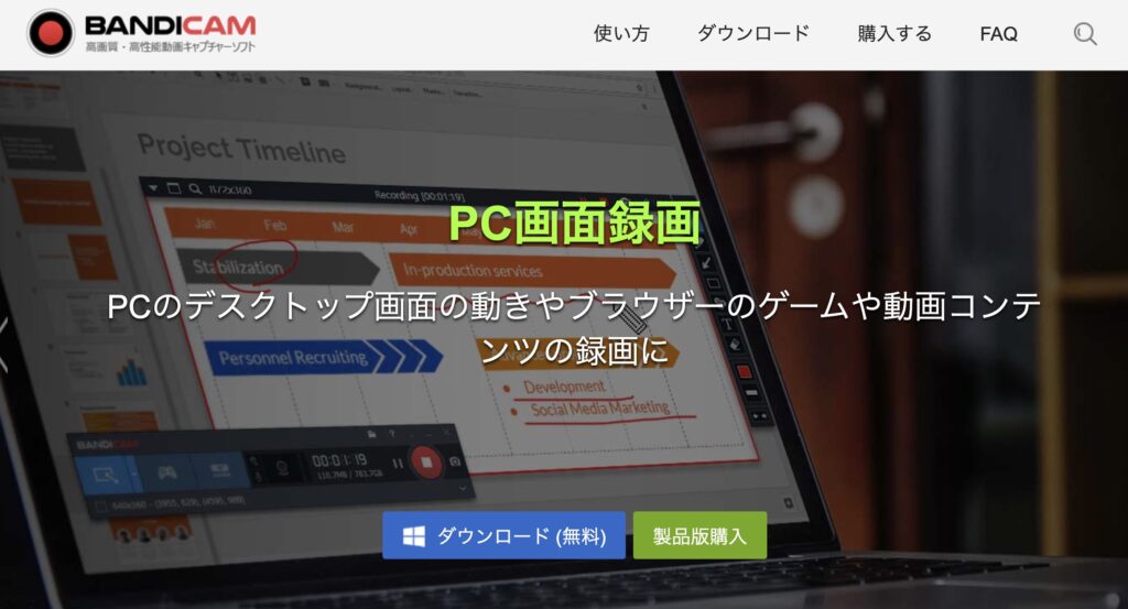 | Bandicam | 買い切り | 軽い・高画質 | 初心者 |
